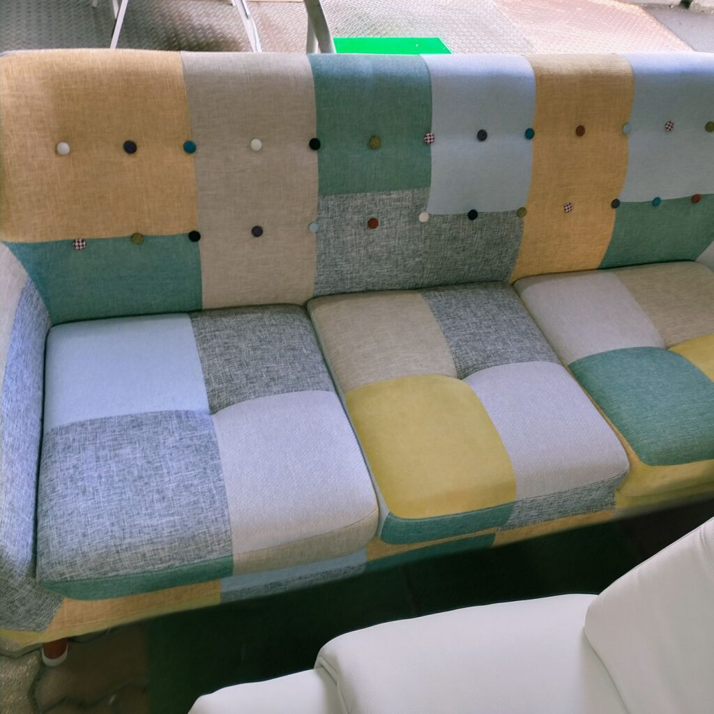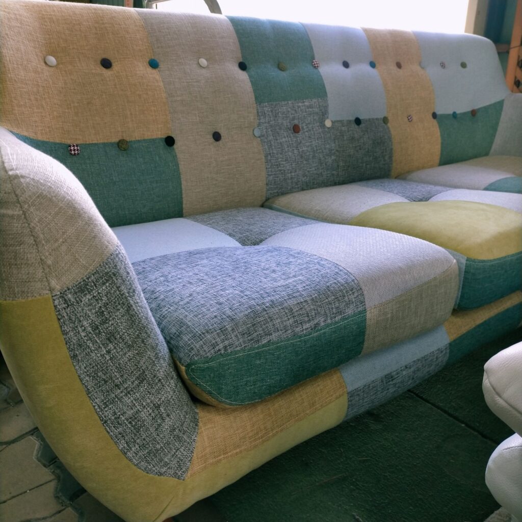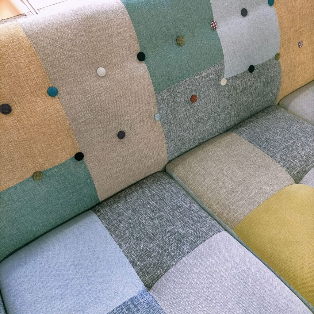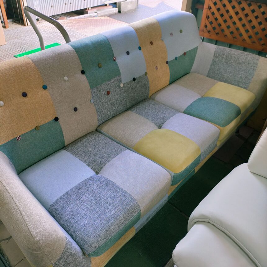 パッチワークデザインで、ボタンの柄も可愛いソファです(*^^*)